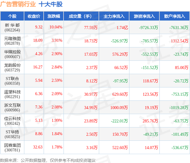 个股表现方面,广告营销行业当日领涨股为新 华 都(002264),该股当日报收9.32,上涨10.04%,成交量77.59万,主力资金净流入1.74亿元。元隆雅图(002878)以上涨3.91%紧随其后,该股当日成交量18.73万,主力资金净流出526.97万元。除此之外,华媒控股(000607)、龙韵股份(603729)、ST联合(600358)均进入当日牛股之列。具体个股列表见下表: