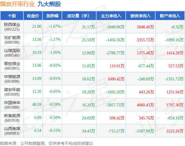 个股表现方面,煤炭开采行业当日领跌股为陕西煤业(601225),该股当日报收21.8,下跌1.67%,成交量31.17万,主力资金净流出5840.06万元。兖矿能源(600188)以下跌1.17%紧随其后,该股当日成交量25.59万,主力资金净流出1456.56万元。除此之外,山煤国际(600546)、晋控煤业(601001)、中煤能源(601898)均进入当日熊股之列。具体个股列表见下表: