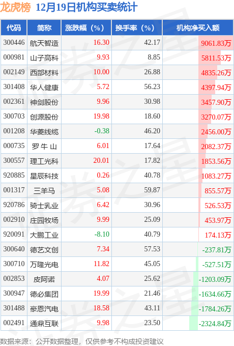 当日公布的交易所龙虎榜中有机构专用席位现身的个股共26家,其中航天智造以净买入9061.83万元排名第一。详情见下表: