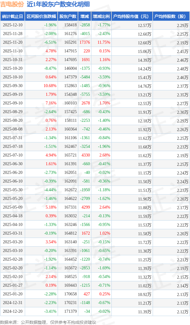从股价来看,2025年11月28日至2025年12月10日,吉电股份区间跌幅为1.96%,在此期间股东户数减少2858.0户,减幅为1.77%。