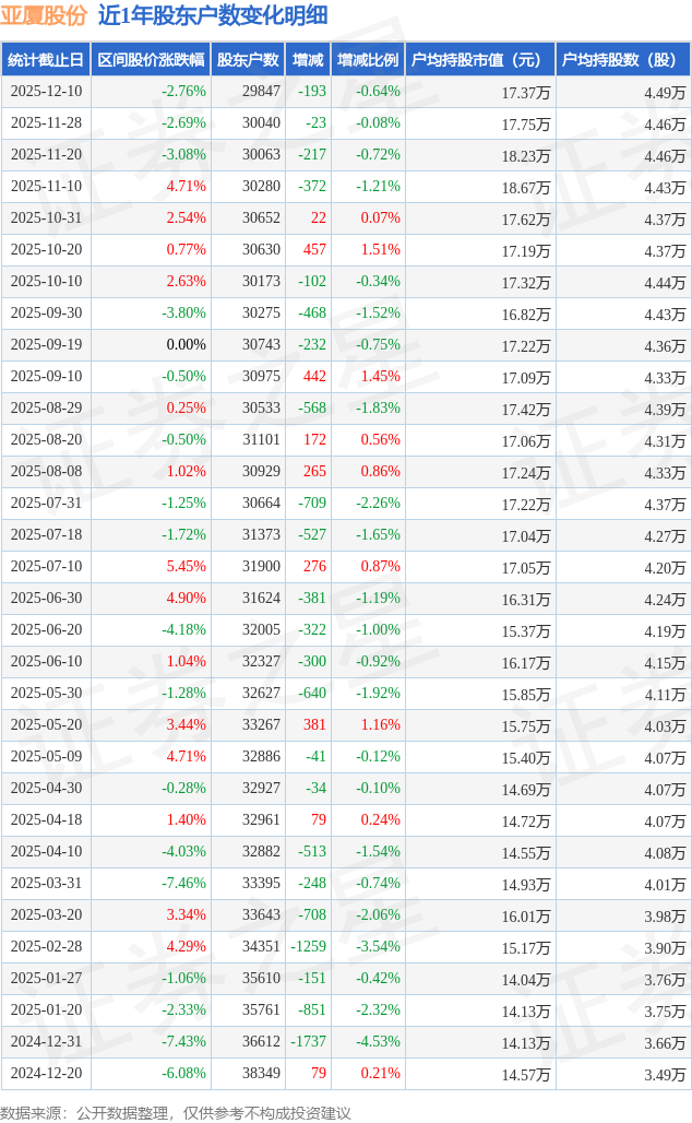 从股价来看,2025年11月28日至2025年12月10日,亚厦股份区间跌幅为2.76%,在此期间股东户数减少193.0户,减幅为0.64%。