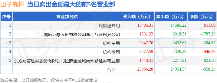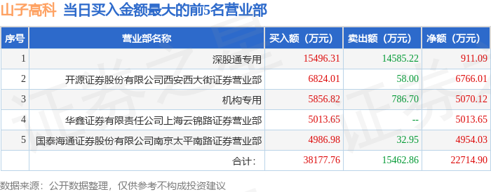 证券之星消息,沪深交易所2025年12月19日公布的交易公开信息显示,山子高科(000981)因日涨幅偏离值达到7%的前5只证券登上龙虎榜。此次是近5个交易日内第1次上榜。