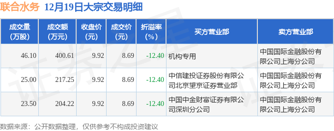 证券之星消息,12月19日联合水务发生大宗交易,交易数据如下: