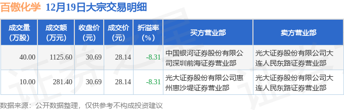 证券之星消息,12月19日百傲化学发生大宗交易,交易数据如下: