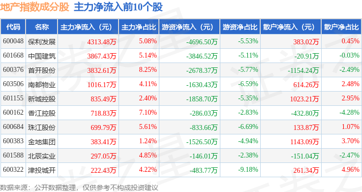 资金流向方面,地产指数(000006)成份股当日主力资金净流入合计1.13亿元,游资资金净流出合计1.78亿元,散户资金净流入合计6445.21万元。成份股资金流向详情见下表: