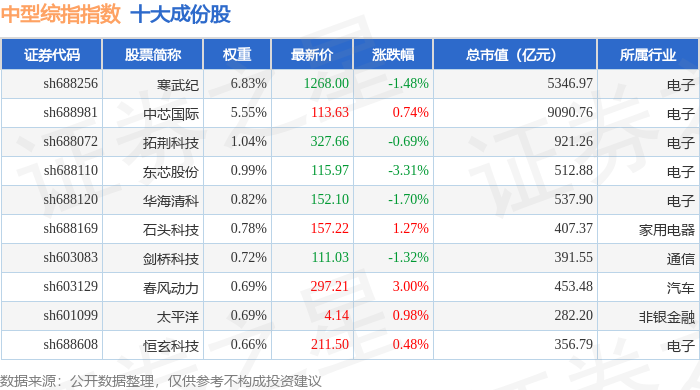 中型综指(000020)指数十大成份股详情如下: