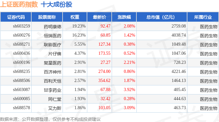 证券之星消息,12月19日,上证医药(000037)指数报收于6492.59点,涨1.3%,成交175.75亿元,换手率0.84%。当日该指数成份股中,上涨的有40家,ST人福以5.03%的涨幅领涨,下跌的有10家,昭衍新药以0.78%的跌幅领跌。