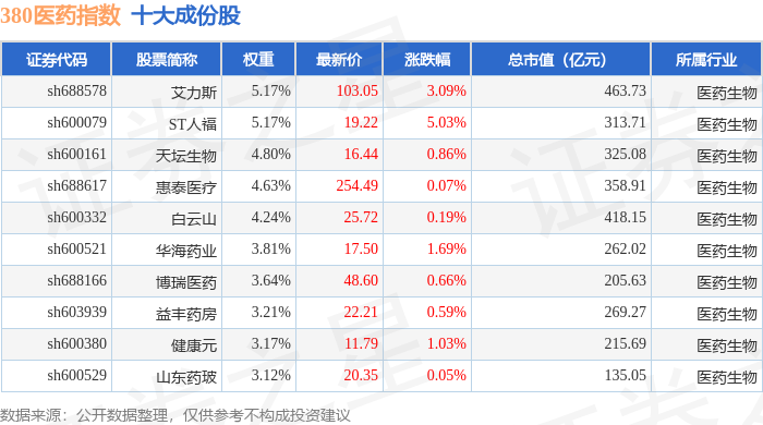 380医药(000109)指数十大成份股详情如下: