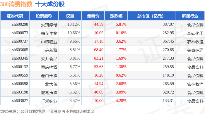 证券之星消息,12月19日,380消费(000108)指数报收于12421.46点,涨2.39%,成交47.3亿元,换手率1.19%。当日该指数成份股中,上涨的有18家,安琪酵母以5.81%的涨幅领涨。