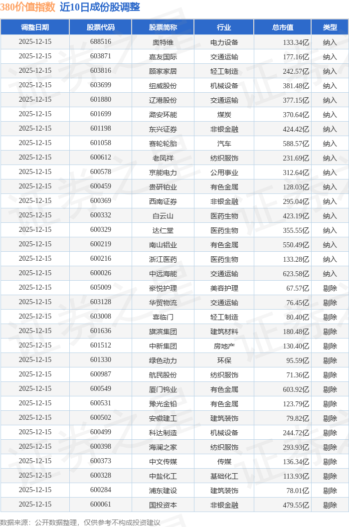 近10日内380价值(000118)指数成份股做了调整,新纳入了17只股票,剔除了16只股票。