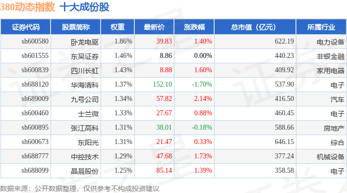 380动态(000141)指数十大成份股详情如下: