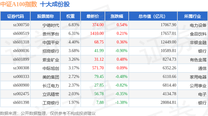 证券之星消息,12月19日,中证A100(000903)指数报收于4425.8点,涨0.35%,成交2000.45亿元,换手率0.49%。当日该指数成份股中,上涨的有75家,中国中免以8.25%的涨幅领涨,下跌的有23家,兆易创新以1.98%的跌幅领跌。