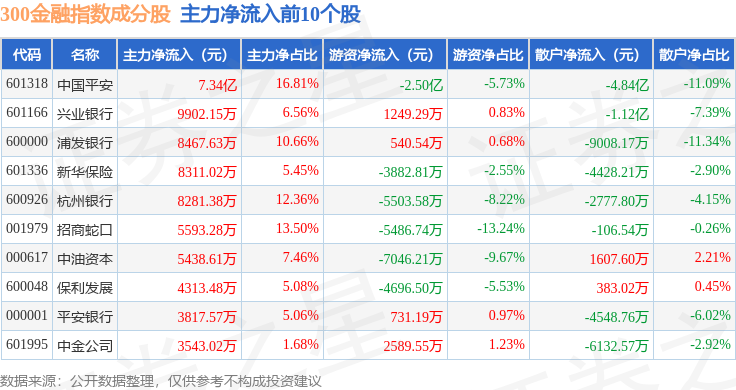 资金流向方面,300金融(000914)指数成份股当日主力资金净流出合计4.42亿元,游资资金净流入合计5.28亿元,散户资金净流出合计8564.99万元。成份股资金流向详情见下表: