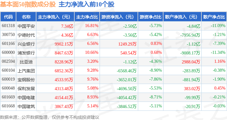 资金流向方面,基本面50(000925)指数成份股当日主力资金净流出合计6.77亿元,游资资金净流入合计2.57亿元,散户资金净流入合计4.21亿元。成份股资金流向详情见下表: