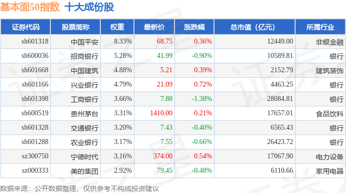 证券之星消息,12月19日,基本面50(000925)指数报收于4633.15点,跌0.15%,成交670.55亿元,换手率0.25%。当日该指数成份股中,上涨的有20家,中国电信以1.65%的涨幅领涨,下跌的有28家,上海银行以1.87%的跌幅领跌。