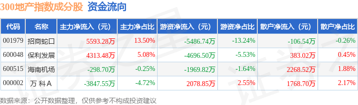 资金流向方面,300地产(000952)指数成份股当日主力资金净流入合计5760.51万元,游资资金净流出合计1.01亿元,散户资金净流入合计4313.71万元。成份股资金流向详情见下表:
