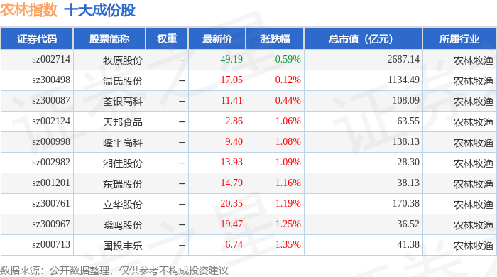 证券之星消息,12月19日,农林指数(399231)报收于1405.68点,涨0.73%,成交93.31亿元,换手率3.58%。当日该指数成份股中,上涨的有25家,神农种业以8.79%的涨幅领涨,下跌的有1家,牧原股份以0.59%的跌幅领跌。