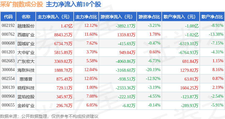 资金流向方面,采矿指数(399232)成份股当日主力资金净流出合计1.37亿元,游资资金净流出合计2971.61万元,散户资金净流入合计1.66亿元。成份股资金流向详情见下表: