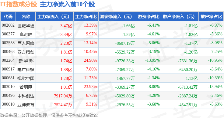资金流向方面,IT指数(399239)成份股当日主力资金净流入合计10.19亿元,游资资金净流出合计13.08亿元,散户资金净流入合计2.88亿元。成份股资金流向详情见下表:
