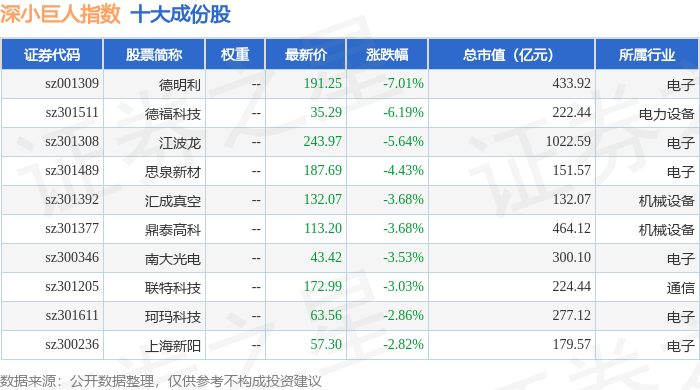 证券之星消息,12月19日,深小巨人(399268)指数报收于2019.06点,跌0.33%,成交702.93亿元,换手率4.37%。当日该指数成份股中,上涨的有60家,航天智造以16.3%的涨幅领涨,下跌的有39家,德明利以7.01%的跌幅领跌。