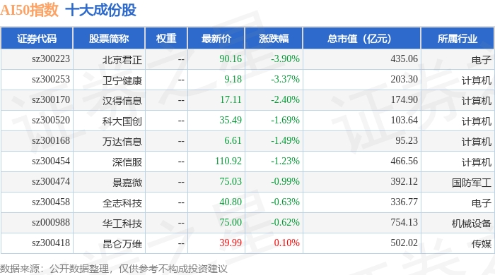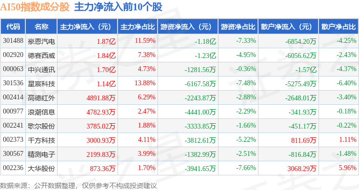 资金流向方面,AI50(399284)指数成份股当日主力资金净流出合计2.34亿元,游资资金净流出合计2.93亿元,散户资金净流入合计5.28亿元。成份股资金流向详情见下表: