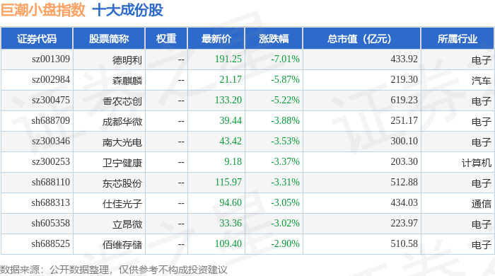 证券之星消息,12月19日,巨潮小盘(399316)指数报收于5762.43点,涨1.0%,成交2473.96亿元,换手率1.74%。当日该指数成份股中,上涨的有403家,信科移动以12.94%的涨幅领涨,下跌的有91家,德明利以7.01%的跌幅领跌。