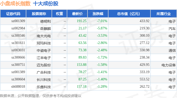 证券之星消息,12月19日,小盘成长(399376)指数报收于6022.14点,涨0.97%,成交829.72亿元,换手率1.89%。当日该指数成份股中,上涨的有131家,海峡股份以8.51%的涨幅领涨,下跌的有32家,德明利以7.01%的跌幅领跌。