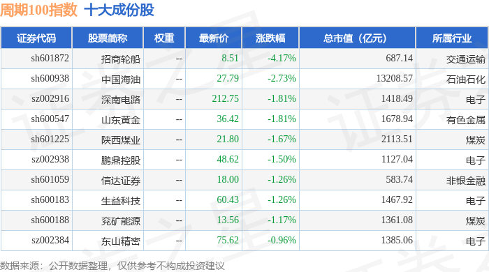 证券之星消息,12月19日,周期100(399402)指数报收于3735.66点,涨0.46%,成交1399.95亿元,换手率0.62%。当日该指数成份股中,上涨的有70家,德赛西威以6.95%的涨幅领涨,下跌的有28家,招商轮船以4.17%的跌幅领跌。