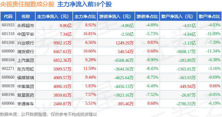 资金流向方面,央视责任(399555)指数成份股当日主力资金净流入合计7.89亿元,游资资金净流出合计3.19亿元,散户资金净流出合计4.7亿元。成份股资金流向详情见下表:
