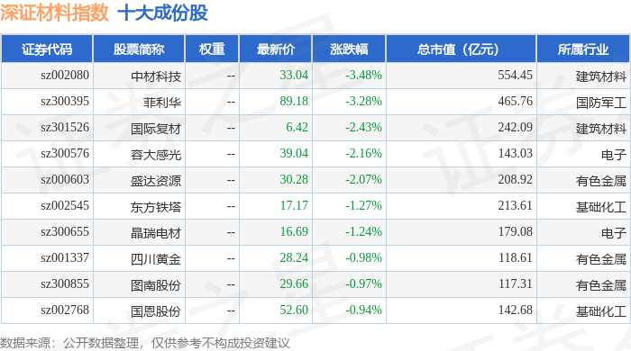 深证材料(399614)指数十大成份股详情如下: