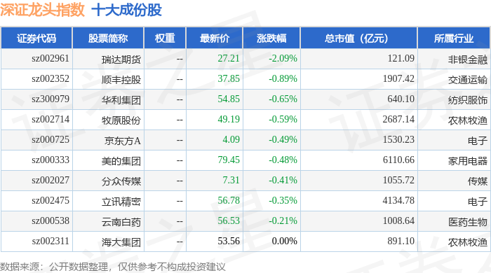 证券之星消息,12月19日,深证龙头(399653)指数报收于2972.8点,涨0.36%,成交684.04亿元,换手率0.94%。当日该指数成份股中,上涨的有40家,特发服务以3.76%的涨幅领涨,下跌的有9家,瑞达期货以2.09%的跌幅领跌。