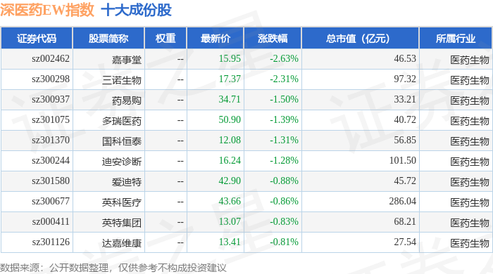 证券之星消息,12月19日,深医药EW(399676)指数报收于3776.01点,涨1.37%,成交463.88亿元,换手率2.74%。当日该指数成份股中,上涨的有190家,维康药业以13.01%的涨幅领涨,下跌的有30家,嘉事堂以2.63%的跌幅领跌。