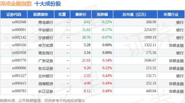 深成金融(399686)指数十大成份股详情如下: