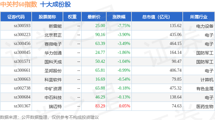中关村60(399697)指数十大成份股详情如下: