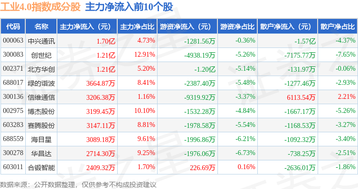资金流向方面,工业4.0(399803)指数成份股当日主力资金净流出合计4.4亿元,游资资金净流出合计3.44亿元,散户资金净流入合计7.85亿元。成份股资金流向详情见下表: