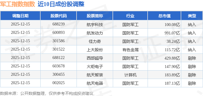 近10日内军工指数(399959)成份股做了调整,新纳入了4只股票,剔除了4只股票。