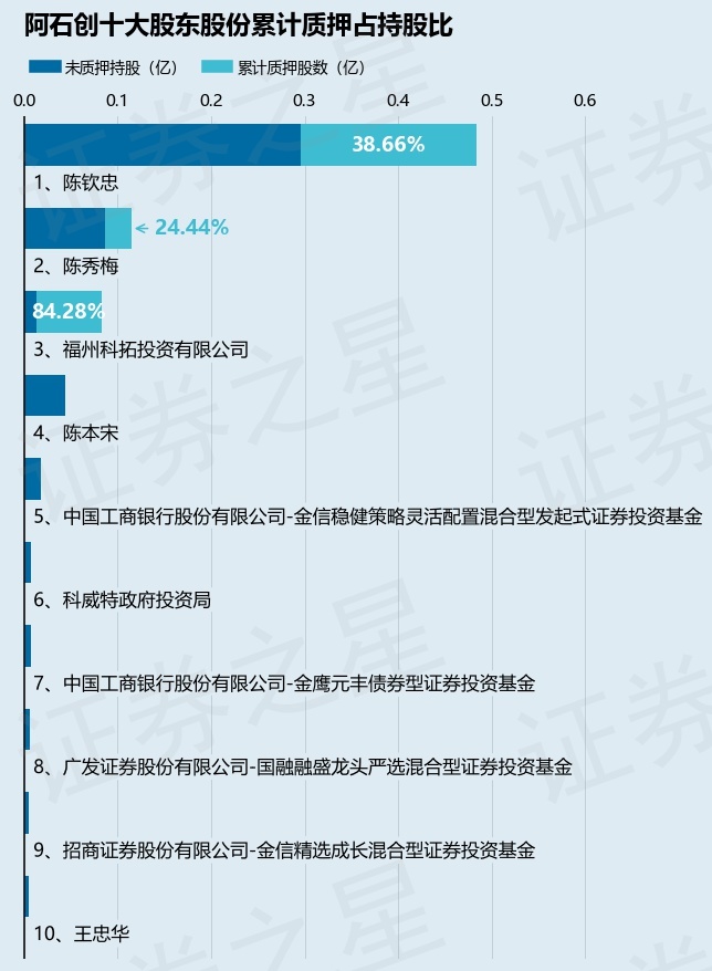 截止本公告日,股东陈钦忠已累计质押股份1868.0万股,占其持股总数的38.66%,股东陈秀梅已累计质押股份280.0万股,占其持股总数的24.44%,股东福州科拓投资有限公司已累计质押股份700.0万股,占其持股总数的84.28%。本次质押后阿石创十大股东的累计质押股份占持股比例(占持股比例的计算以公司最新一期财务报表公布的十大股东的持股总数为基准)见下图: