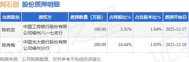 证券之星消息,阿石创(300706)12月19日公开信息显示,股东陈钦忠、陈秀梅向中国工商银行股份有限公司福州八一七支行、中国光大银行股份有限公司福州分行合计质押440.0万股,占总股本2.87%。质押详情见下表: