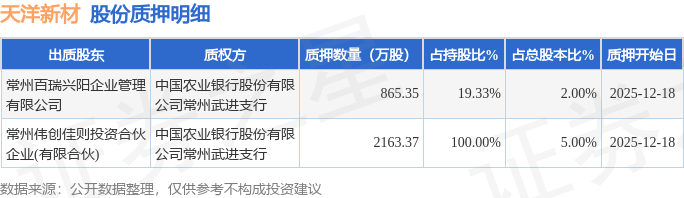 证券之星消息,天洋新材(603330)12月19日公开信息显示,股东常州百瑞兴阳企业管理有限公司、常州伟创佳则投资合伙企业(有限合伙)向中国农业银行股份有限公司常州武进支行合计质押3028.72万股,占总股本7.0%。质押详情见下表: