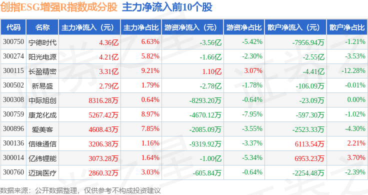 资金流向方面,创指ESG增强R(470034)指数成份股当日主力资金净流入合计1.09亿元,游资资金净流出合计5.64亿元,散户资金净流入合计4.56亿元。成份股资金流向详情见下表: