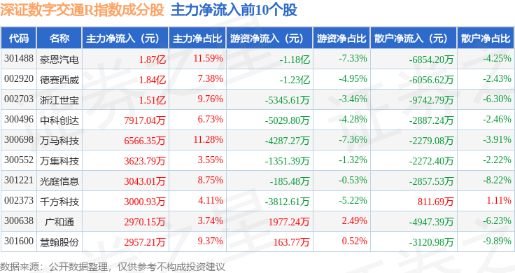 资金流向方面,深证数字交通R(470049)指数成份股当日主力资金净流入合计6.06亿元,游资资金净流出合计5.66亿元,散户资金净流出合计4033.54万元。成份股资金流向详情见下表: