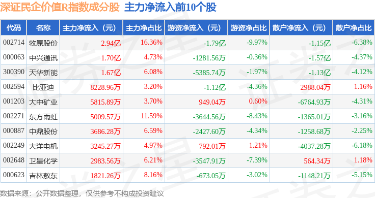 资金流向方面,深证民企价值R(470072)指数成份股当日主力资金净流入合计2.47亿元,游资资金净流出合计5.06亿元,散户资金净流入合计2.59亿元。成份股资金流向详情见下表: