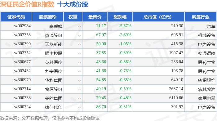 证券之星消息,12月19日,深证民企价值R(470072)指数报收于4639.83点,涨0.55%,成交322.94亿元,换手率1.09%。当日该指数成份股中,上涨的有40家,恒逸石化以5.2%的涨幅领涨,下跌的有10家,森麒麟以5.87%的跌幅领跌。