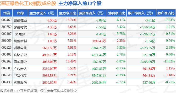 资金流向方面,深证绿色化工R(470076)指数成份股当日主力资金净流入合计13.92亿元,游资资金净流出合计8.84亿元,散户资金净流出合计5.08亿元。成份股资金流向详情见下表: