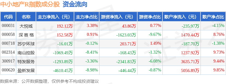 资金流向方面,中小地产R(471002)指数成份股当日主力资金净流出合计6645.13万元,游资资金净流出合计4332.15万元,散户资金净流入合计1.1亿元。成份股资金流向详情见下表: