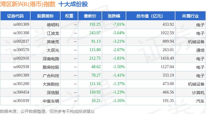 湾区新兴R(港币)(480008)指数十大成份股详情如下: