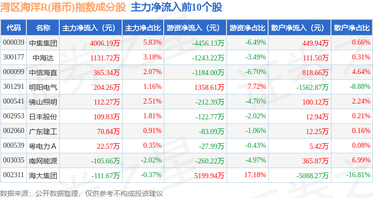 资金流向方面,湾区海洋R(港币)(480020)指数成份股当日主力资金净流出合计3601.5万元,游资资金净流入合计2825.46万元,散户资金净流入合计776.04万元。成份股资金流向详情见下表: