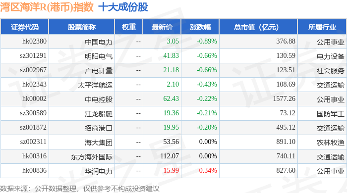 湾区海洋R(港币)(480020)指数十大成份股详情如下: