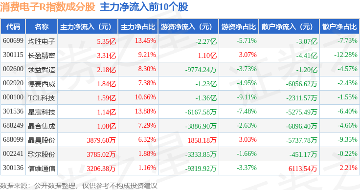 资金流向方面,消费电子R(480030)指数成份股当日主力资金净流入合计6160.88万元,游资资金净流出合计1.81亿元,散户资金净流入合计1.2亿元。成份股资金流向详情见下表: