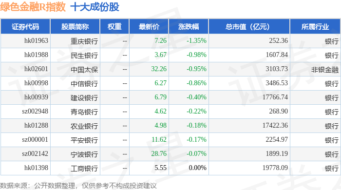 绿色金融R(480052)指数十大成份股详情如下: